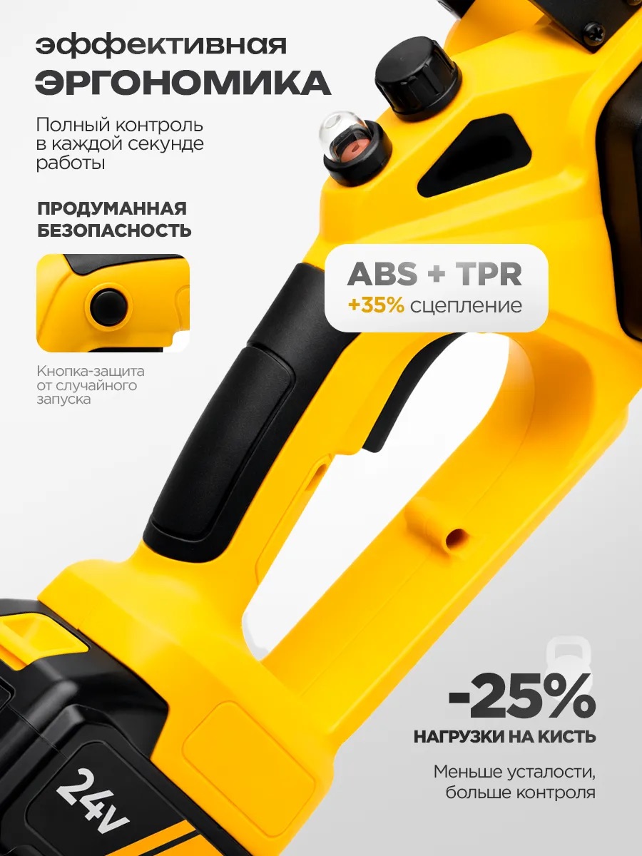 Два ёмких Li-Ion аккумулятора (4.5 Ah, 24V) обеспечивают долгую работу без подзарядки. Быстрая смена батареи — работай без простоев!